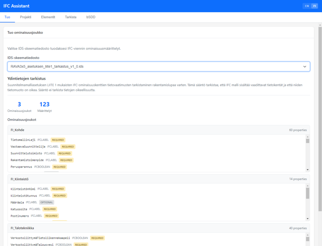 Laajennus lukee säännöt suoraan IDS-tiedostosta (Information Delivery Specification). buildingSMARTin julkaisemasta avoimesta standardista, jonka muodossa RAVA3Pro:n kansalliset vaatimukset on julkaistu. Olemme tehneet sen pohjalta laajemman IDS-tiedoston, joka kattaa myös kaikki elementtityyppikohtaiset vaatimukset.