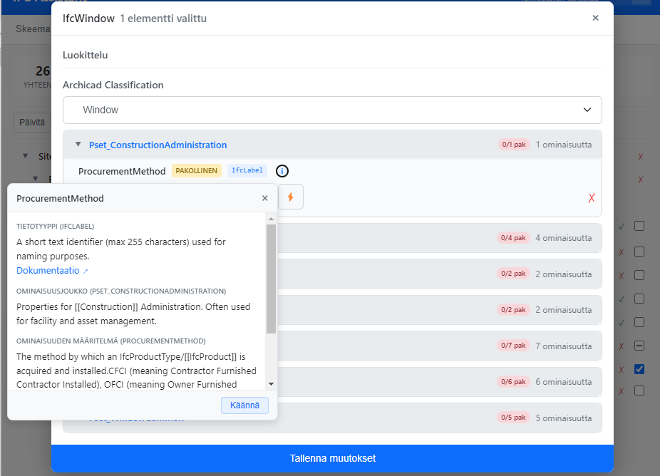 bSDD-tietoikkuna avaa ominaisuuden virallisen määritelmän suoraan muokkausnäkymässä, käyttäjän ei tarvitse hakea tietoja erillisistä lähteistä.