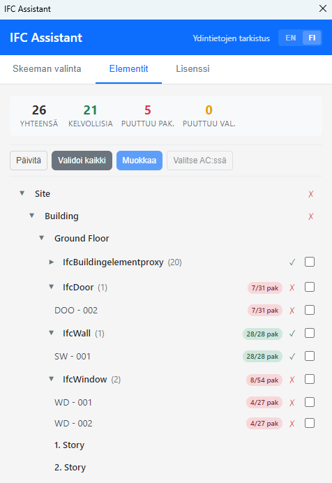 Projektin IFC-rakenne yhdellä silmäyksellä. Yläpalkin tilastot kertovat heti, kuinka monelta elementiltä puuttuu pakollisia tai valinnaisia tietoja.