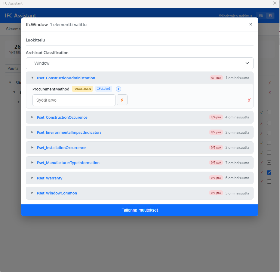 Yksittäisen elementin napsauttaminen avaa muokkausnäkymän, jossa kaikki sen IFC-tiedot ovat ryhmiteltyinä ominaisuusjoukkojen (Property Set) mukaan. Kentät mukautuvat automaattisesti tietotyypin mukaan: tekstikenttä, valintaruutu, numerokenttä, pudotusvalikko tai päivämäärä.
